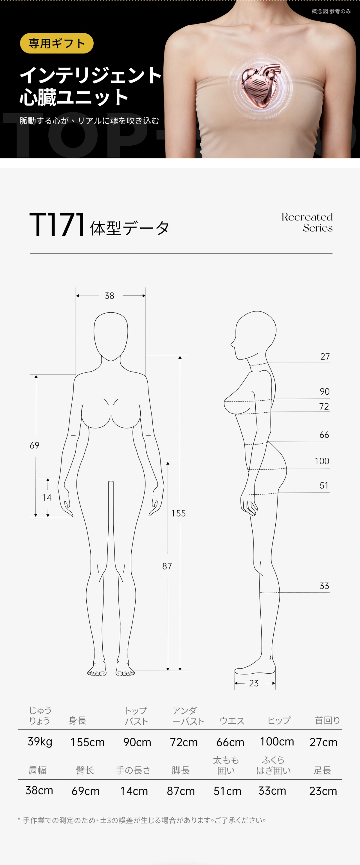 - 【サイズ】95cm Dカップ、体重:27kg、肩幅:38cm、トップバスト:86cm、アンダーバスト:68cm、ウエスト:61cm、ヒップ:89cm